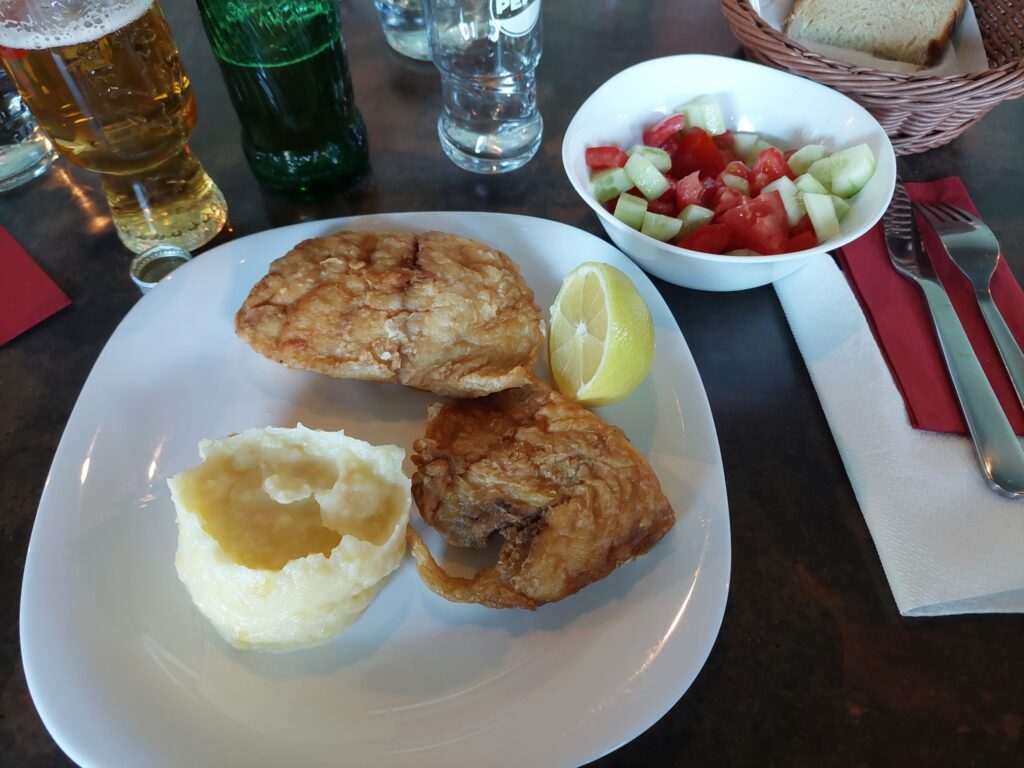 Op het menu stond vanavond – hoe kan het ook anders – een heerlijke vissoep en daarna baars met puree en een slaatje. Om vingers en duimen af te likken. En als afsluitertje nog een glaasje tuica, aangeboden door het hotel.